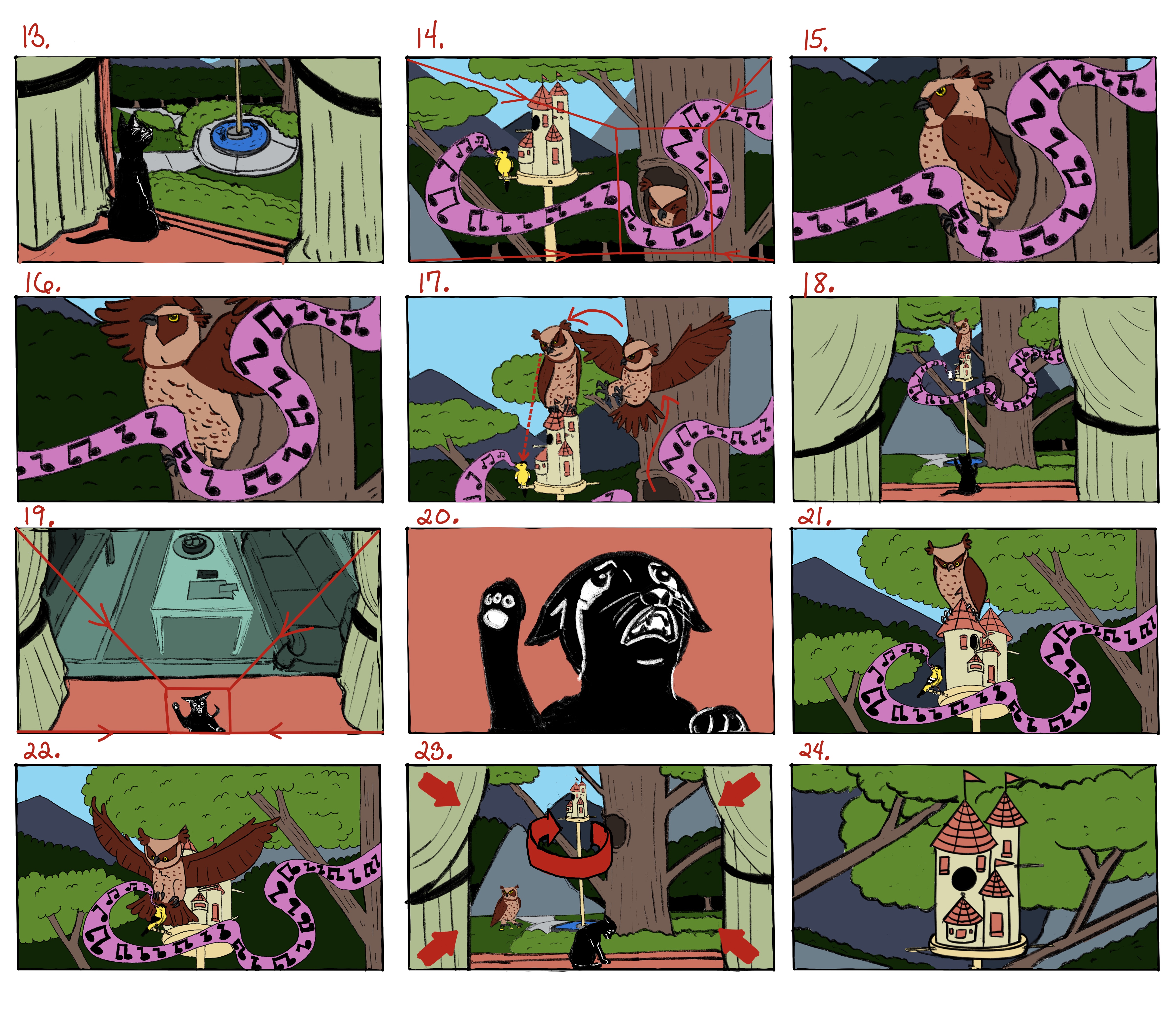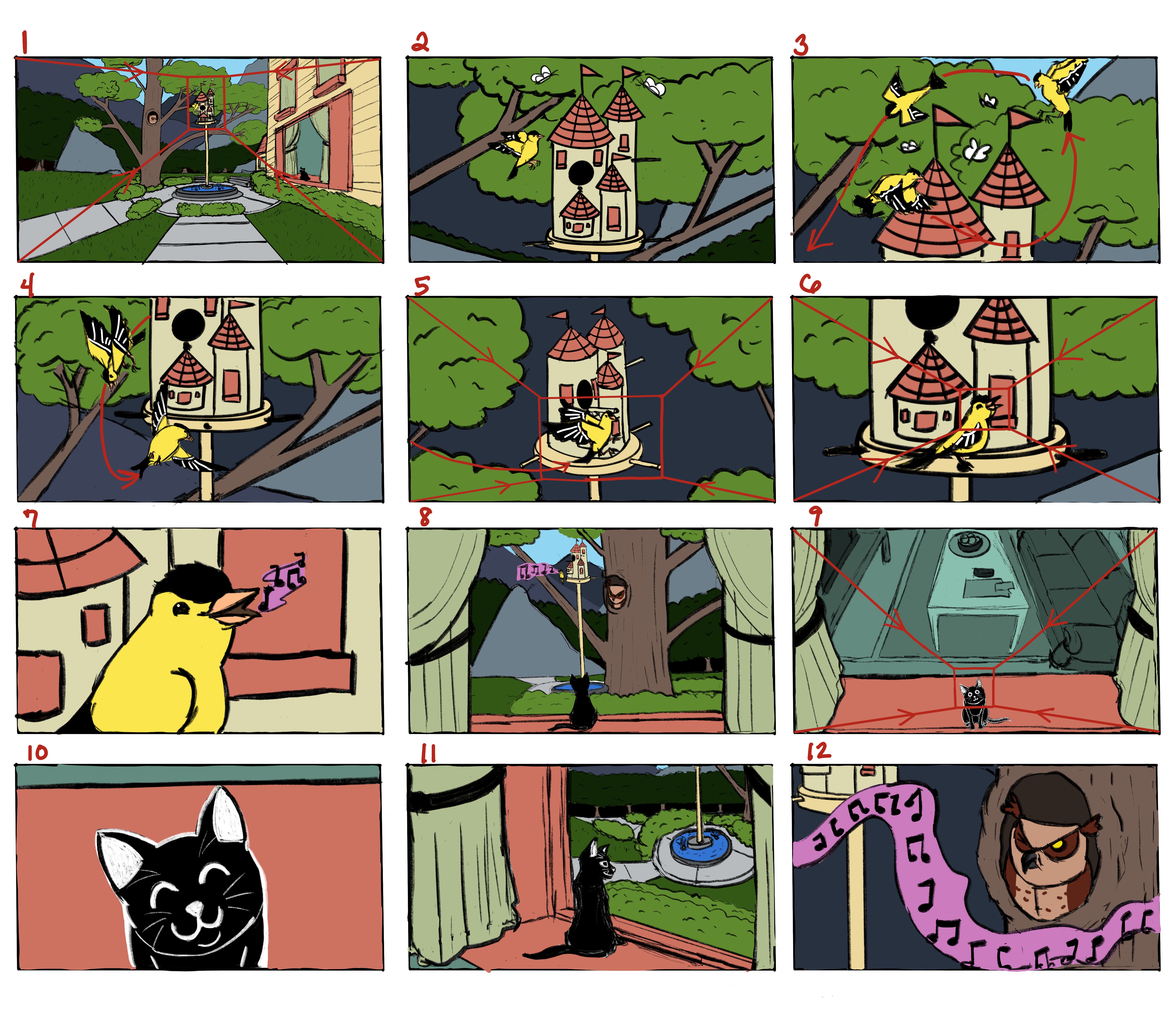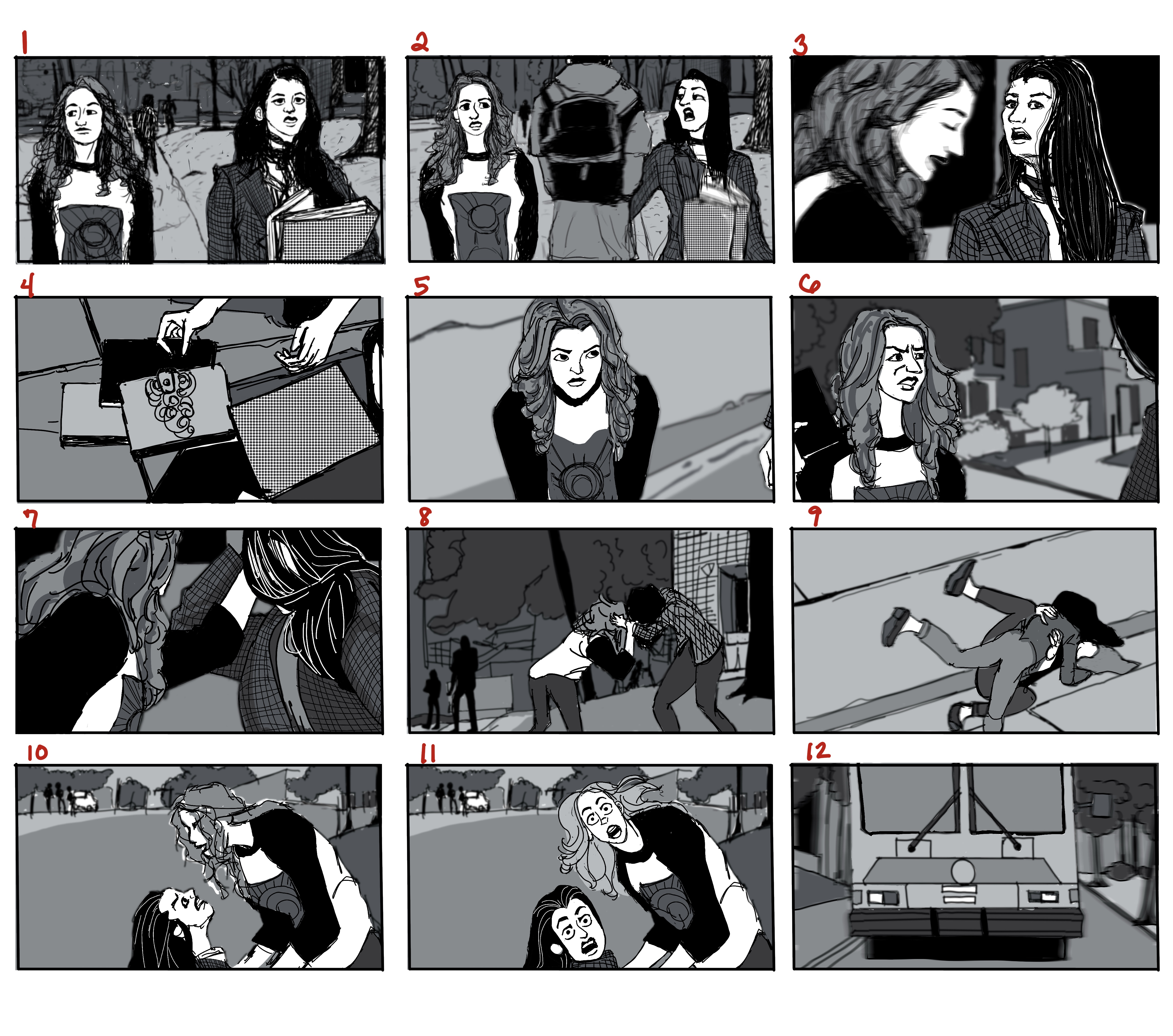 The storyboard depicts a scene from the movie Happy Death Day in which the main character, Tree, investigates who is after her. She is investigating her friend Danielle when she finds the ominous black birthday card in her possession, and a fight occurs.
